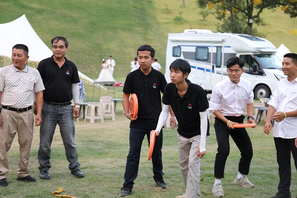 温馨的生日会在欢乐的游戏环节中无缝衔接进入主题,瞬间将活动现场的气氛推至高潮。由寿星分别组队比拼的飞盘三子棋、爱的魔力套圈圈游戏,再现了团队的凝聚力和拼搏精神,唤醒了潜藏的幽默与运动细胞,让员工们一同在山谷间享受绽放在声声欢笑中的愉悦。